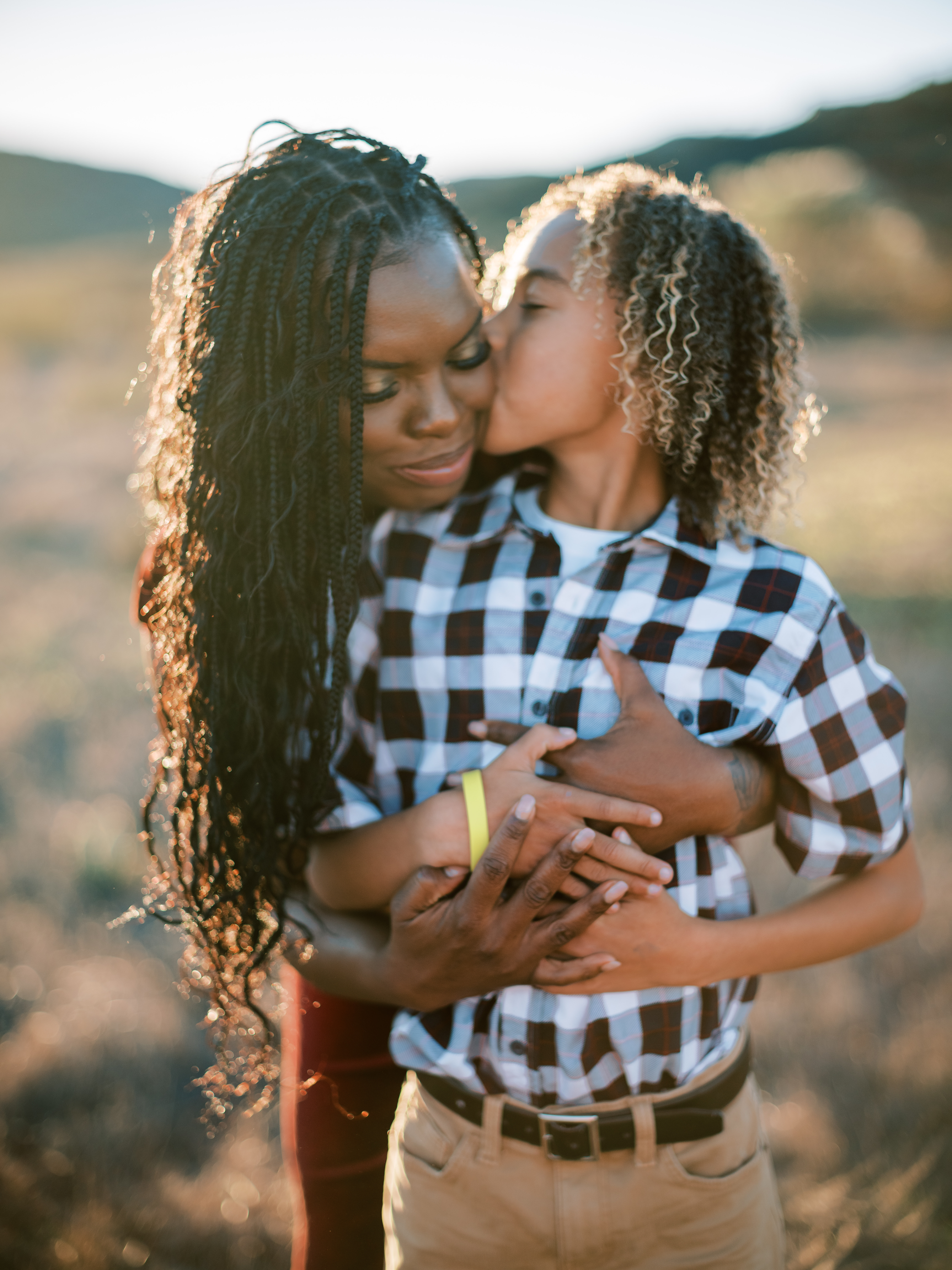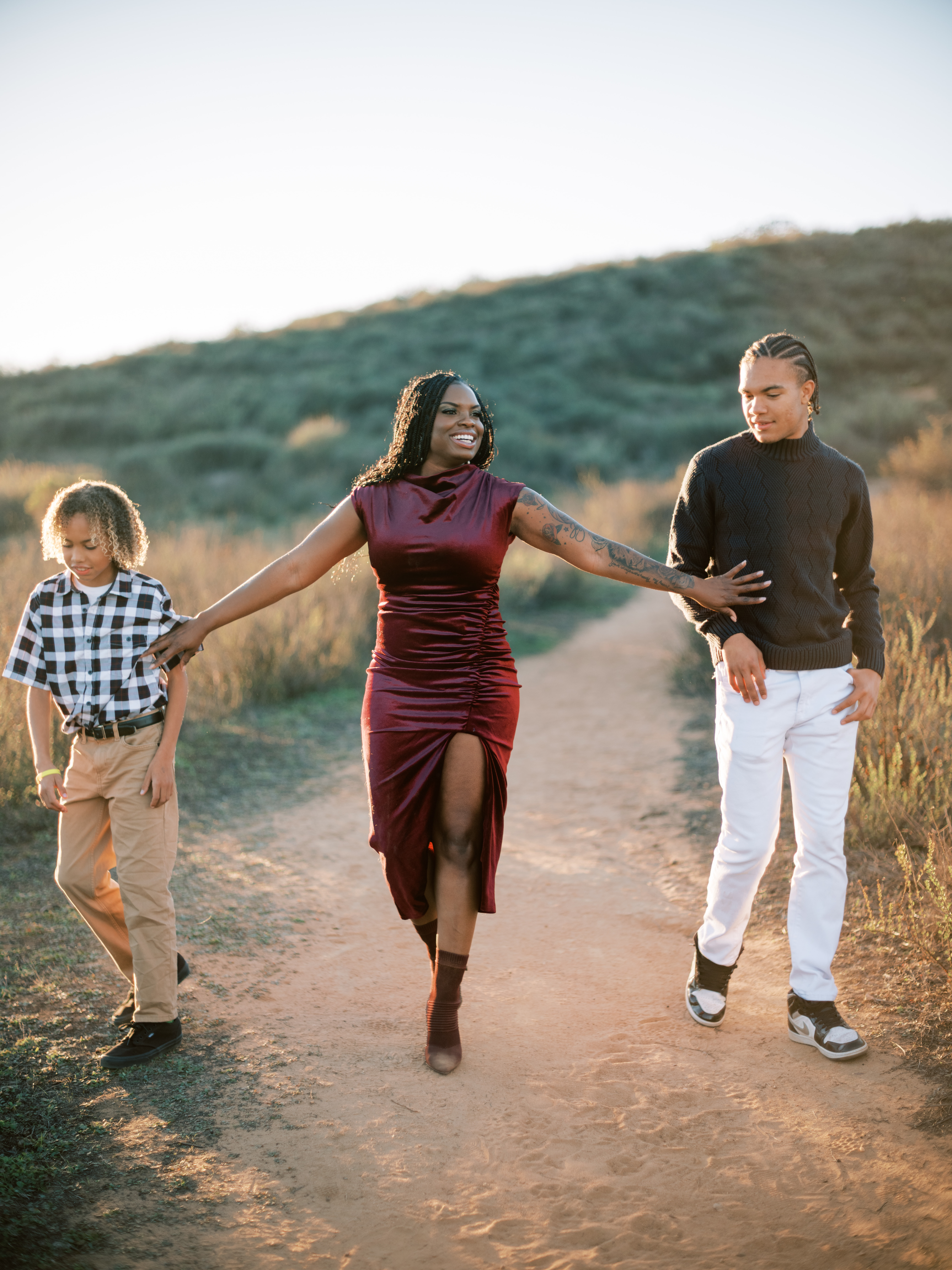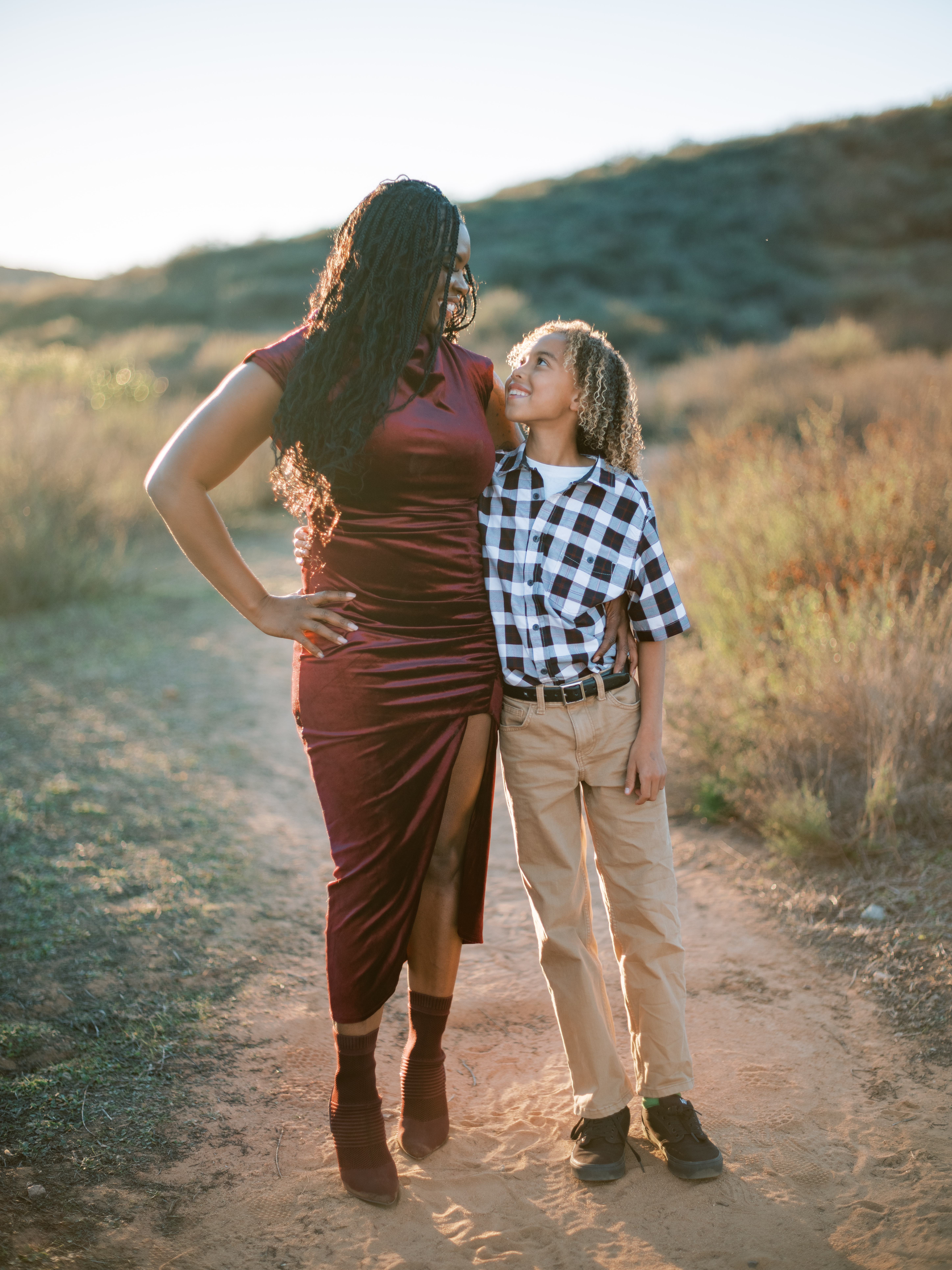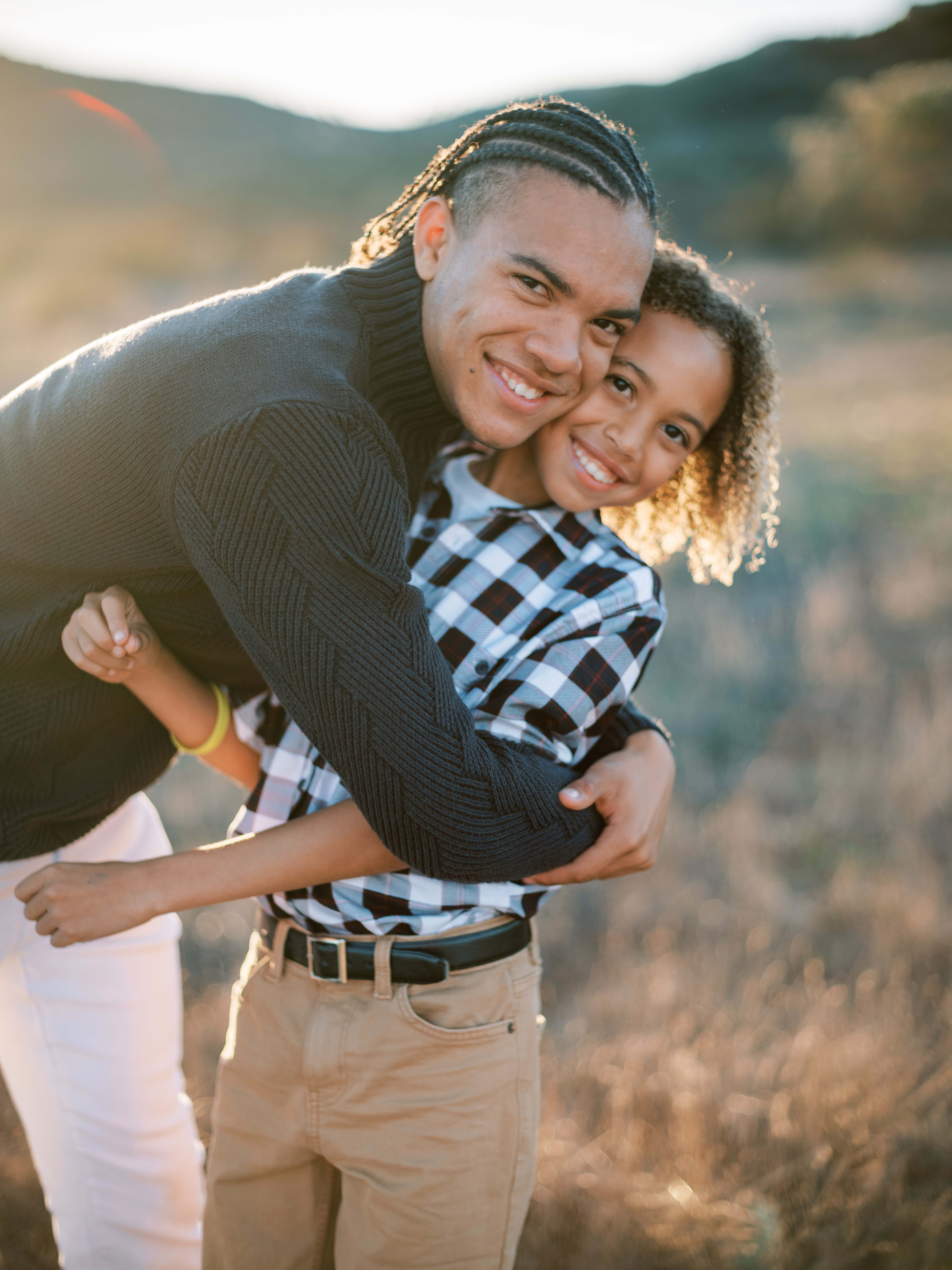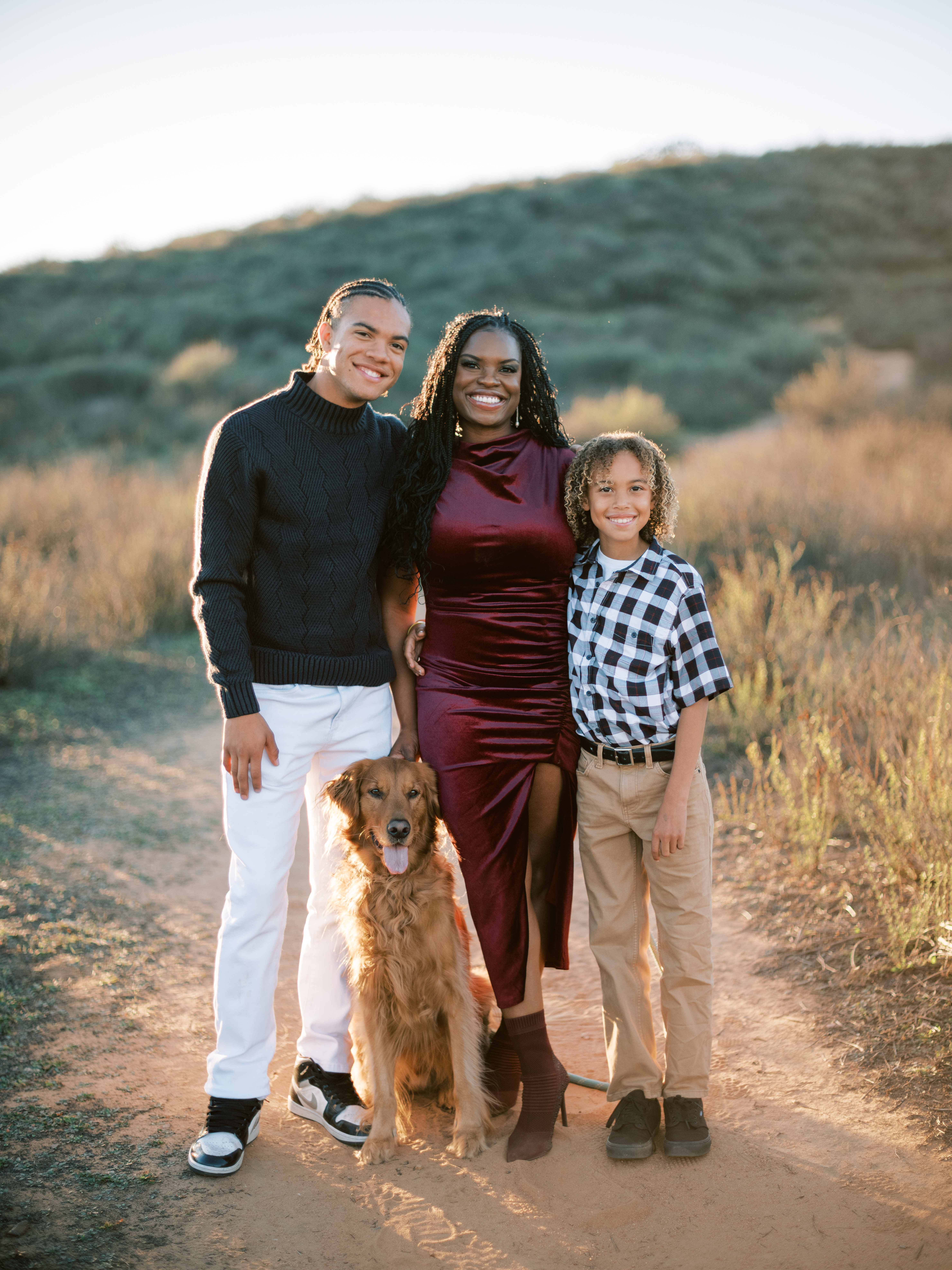 The trails at Lake Hodges offered a perfect backdrop — wide open spaces to explore, golden light peeking behind the mountains, and quiet corners for moments of stillness. The winter evening cast that warm California glow that makes every hug and glance feel a little more radiant. Mozzarella was there for every squeeze, tail wag, and moment of pure joy, reminding us that pets are often the heartbeats of family sessions.
